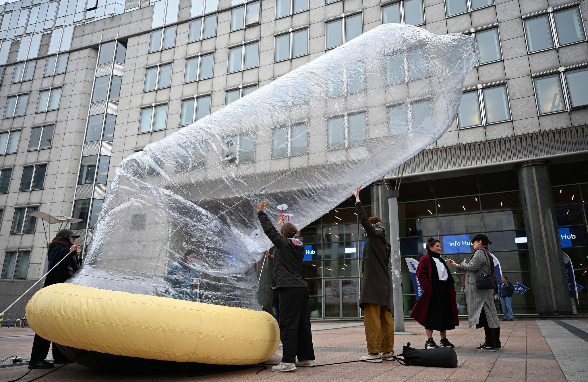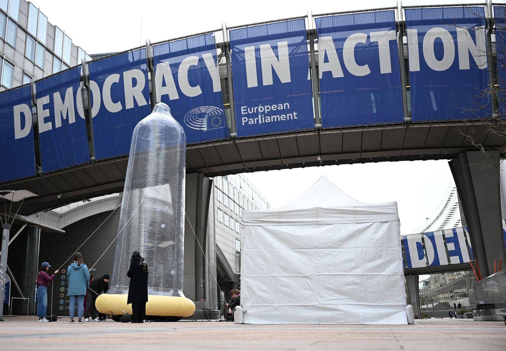 Brüssel | Riesen-Kondom vor EU-Parlament: Mehr zu Verhütung forschen