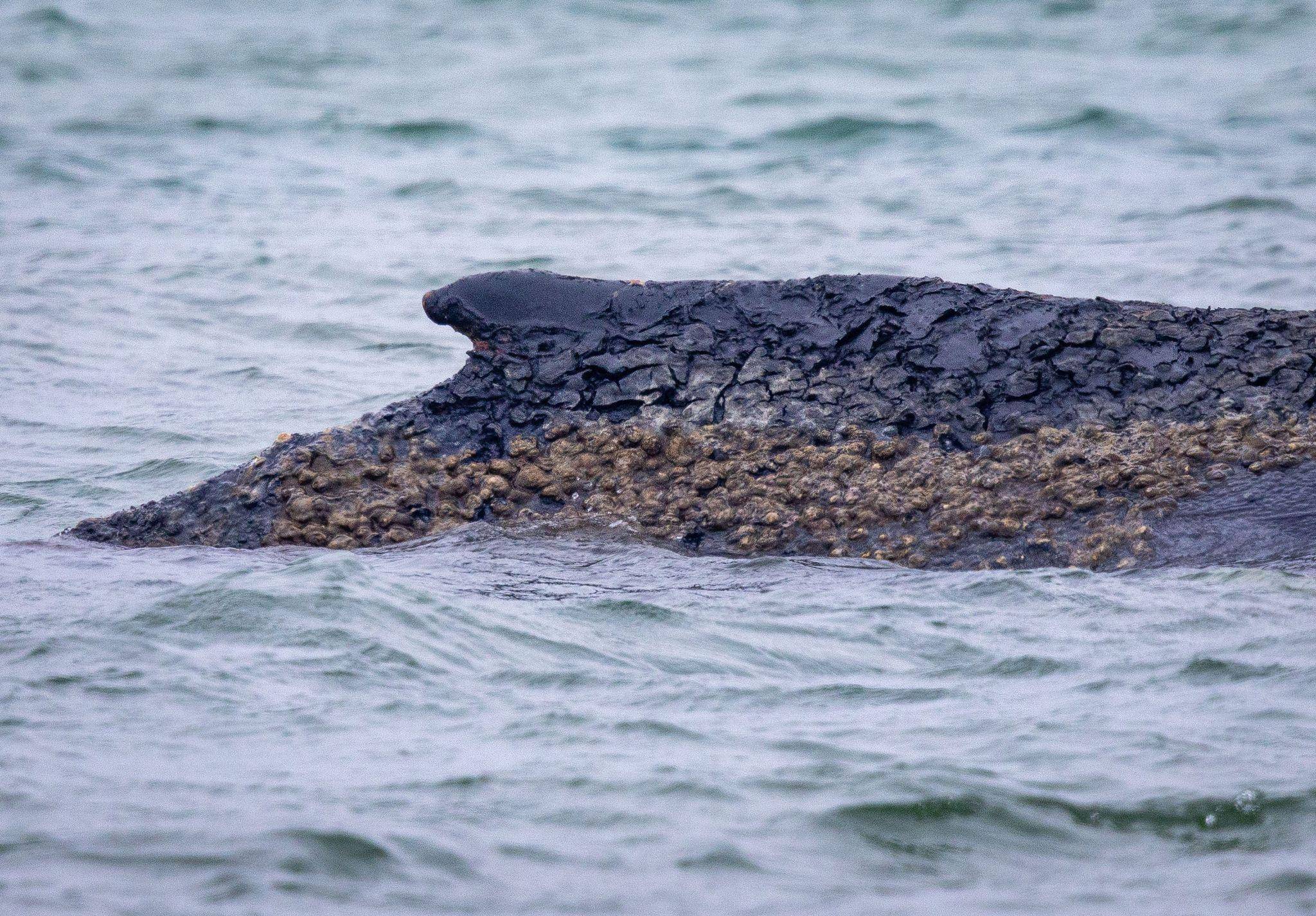 Das Jungtier liegt seit Montagfrüh auf einer Sandbank vor Niendorf, einem Ortsteil von Timmendorfer Strand. Sein Rücken ragt aus dem Wasser und die brummenden Töne, die der Wal von sich gibt, sind noch hunderte Meter entfernt zu hören.